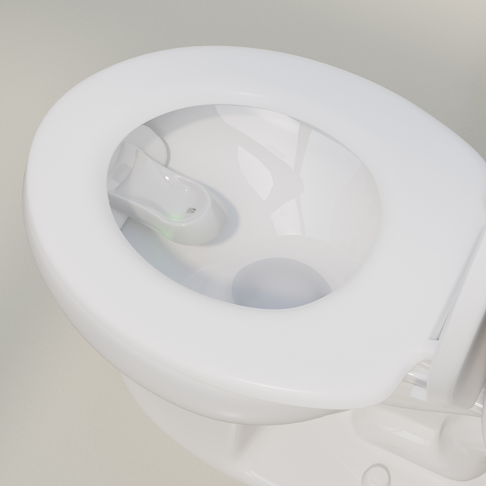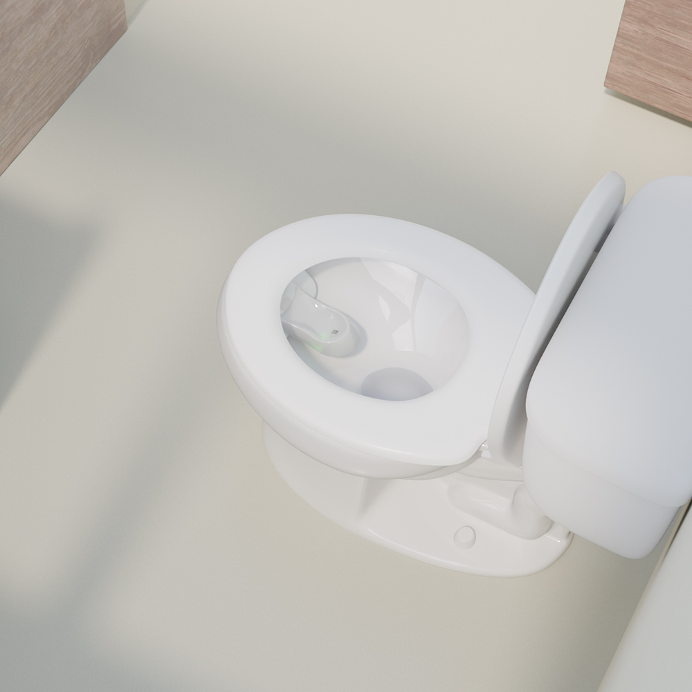 Included in your shipment box will be the device, anchor(s), and a user manual. Pete clips into the provided adhesive anchor at the front of your toilet bowl, just under the flush holes.